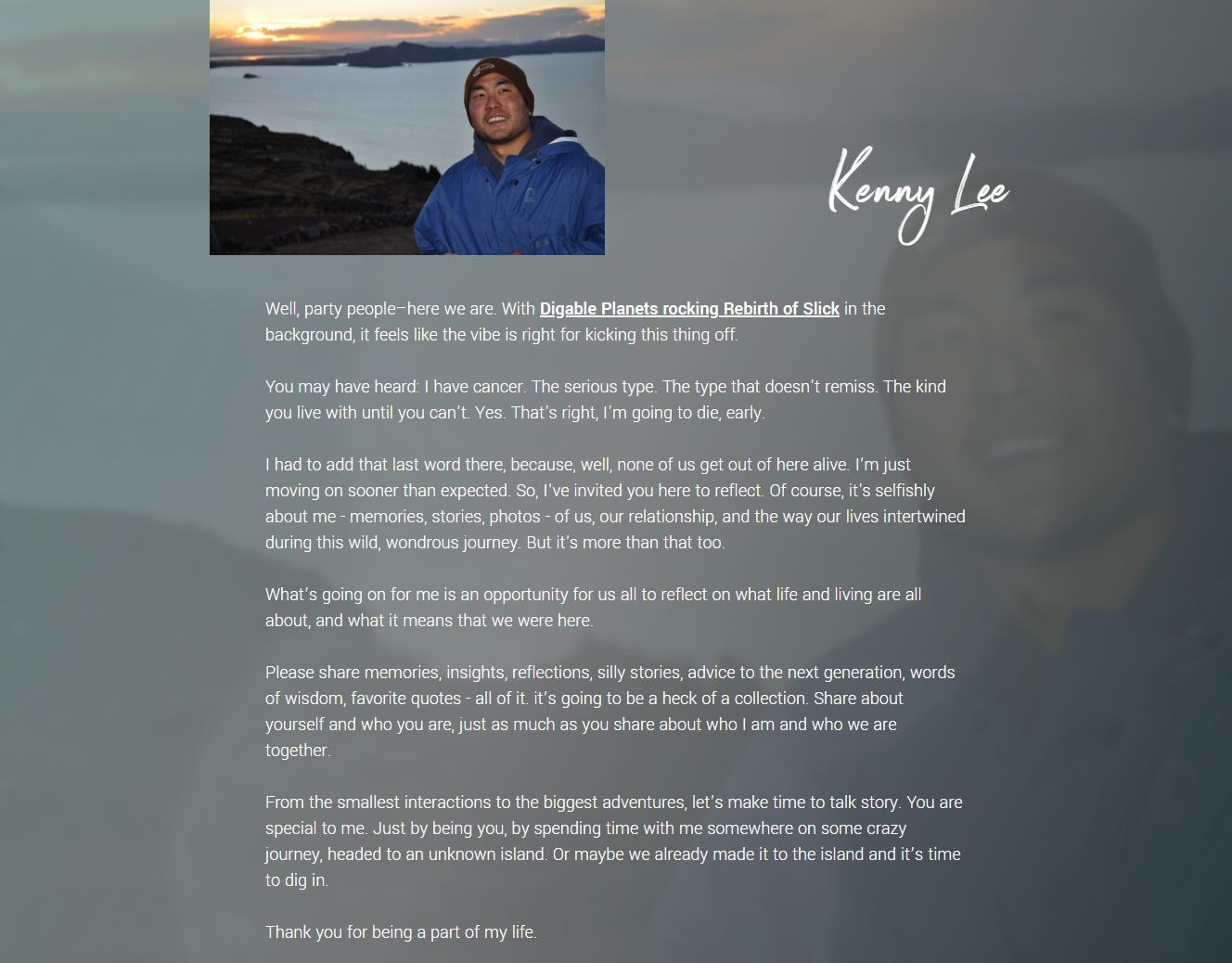 I found out my writing class friend, Kenny Lee, passed away and the site he created was one of the most beautiful ways to exit I have seen. He knew he was going to pass away - he told people and created a site for this exit and to exist after it. “Well, party people–here we are. With Digable Planets rocking Rebirth of Slick in the background, it feels like the vibe is right for kicking this thing off.”